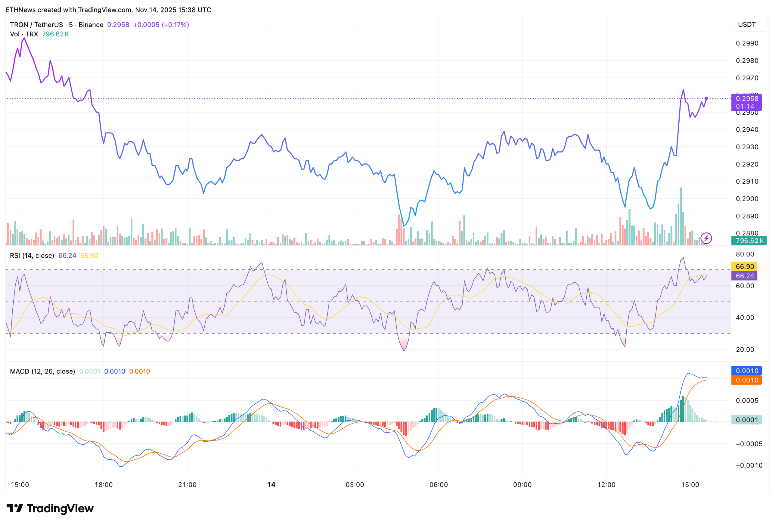 TradingView图表显示TRX在整个交易时段逐渐丧失动能,最终在0.295美元区域附近企稳。相对强弱指数(RSI14)当前值为66.24,信号线位于66.9,显示日内反弹时出现轻度超买但未能有效突破。这一走势与市场整体承压态势吻合——每次短期反弹都迅速遭遇阻力。
