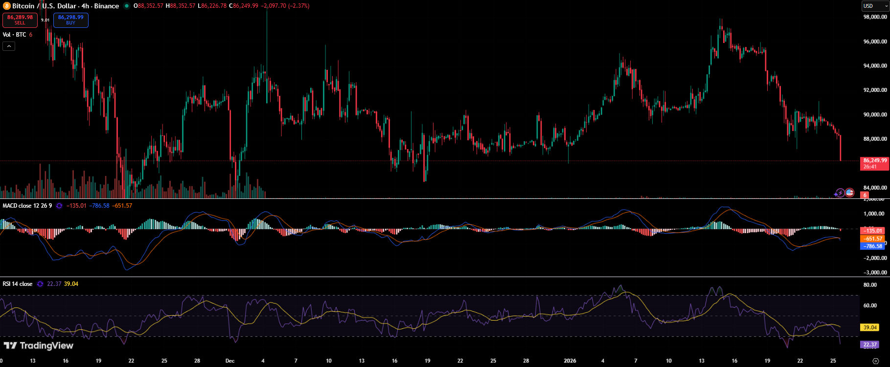 从技术角度看,市场结构同样恶化。在4小时图上,比特币自本月早前未能突破96,000-98,000美元区域后,持续形成更低的高点和更低的低点。动能指标强化了看跌基调:MACD仍处深度负值区间,RSI则在尝试小幅反弹前近期跌近超卖区域。