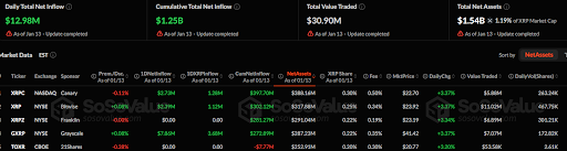 截至1月13日,XRP ETF单日总净流入达到1298万美元。据SoSoValue数据显示,累计总净流入目前为12.5亿美元。与此同时,所有上市产品的总净资产达到15.4亿美元,约占XRP市值的1.19%。