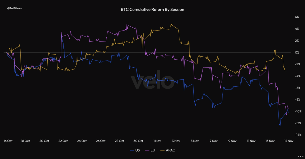 Coinbase比特币溢价指数现报-0.07%,证实美国交易员正在抛售。分析师Ted指出:"亚洲交易者导致比特币从126k跌至100k,而跌破100k则由美国机构抛售引发,美国现已成为最大卖方。"