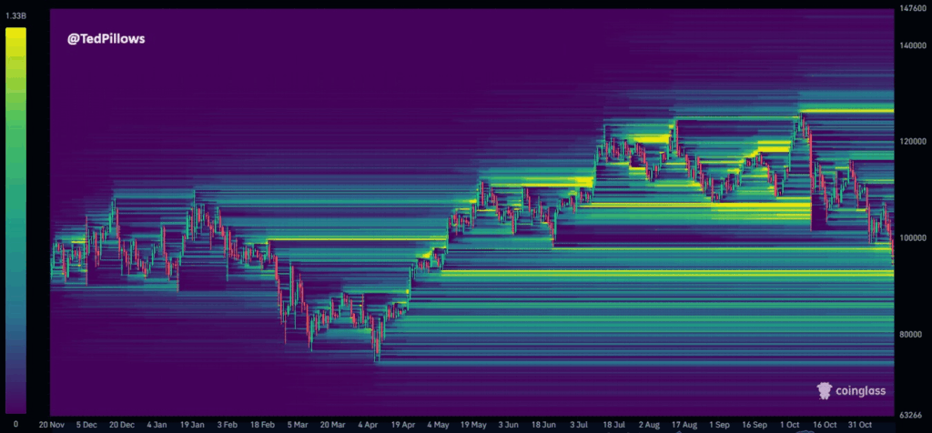 分析师Ted警告若无法守住98,000美元支撑,可能引发连环清算,或将价格打压至90,000-92,000美元流动性聚集区。