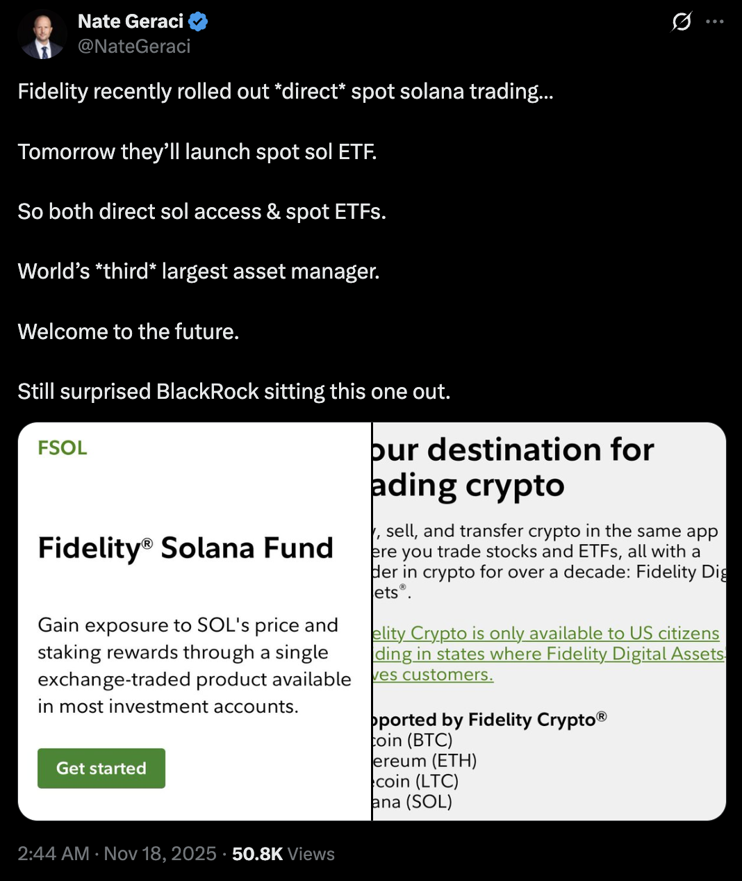 美国市场今日因富达Solana ETF($FSOL)和Canary Marinade的$SOLC推出而升温。