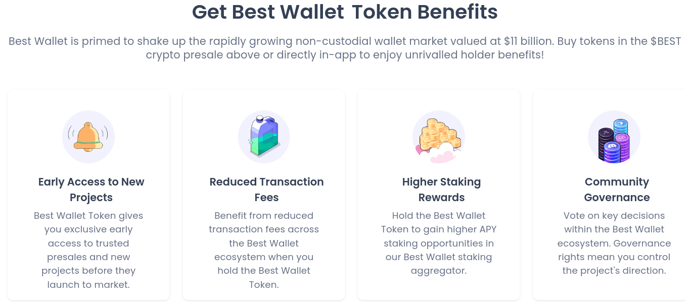 Best Wallet Token通过早期项目参与、费用减免及更高质押收益提供实用价值。
