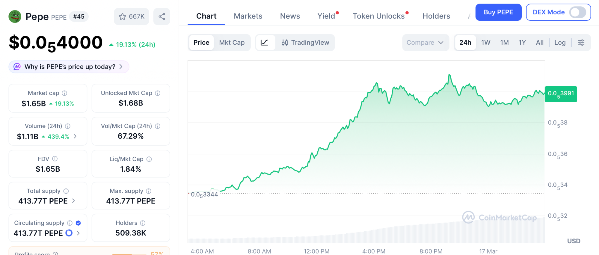 据CoinMarketCap数据,PEPE当前交易价格为0.0000040美元,市值达16.8亿美元。而PEPE的联合创始人已离开并创建了Pepeto。