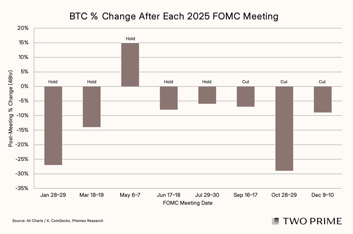 Two Prime追踪2025年全部八次联邦公开市场委员会会议后比特币价格变化的数据,显示出一个显著规律:在这八次会议中,有七次比特币在会议后48小时内出现下跌。其中五次会议维持利率不变,三次会议宣布降息。最终决议结果并不重要,这一规律始终成立。