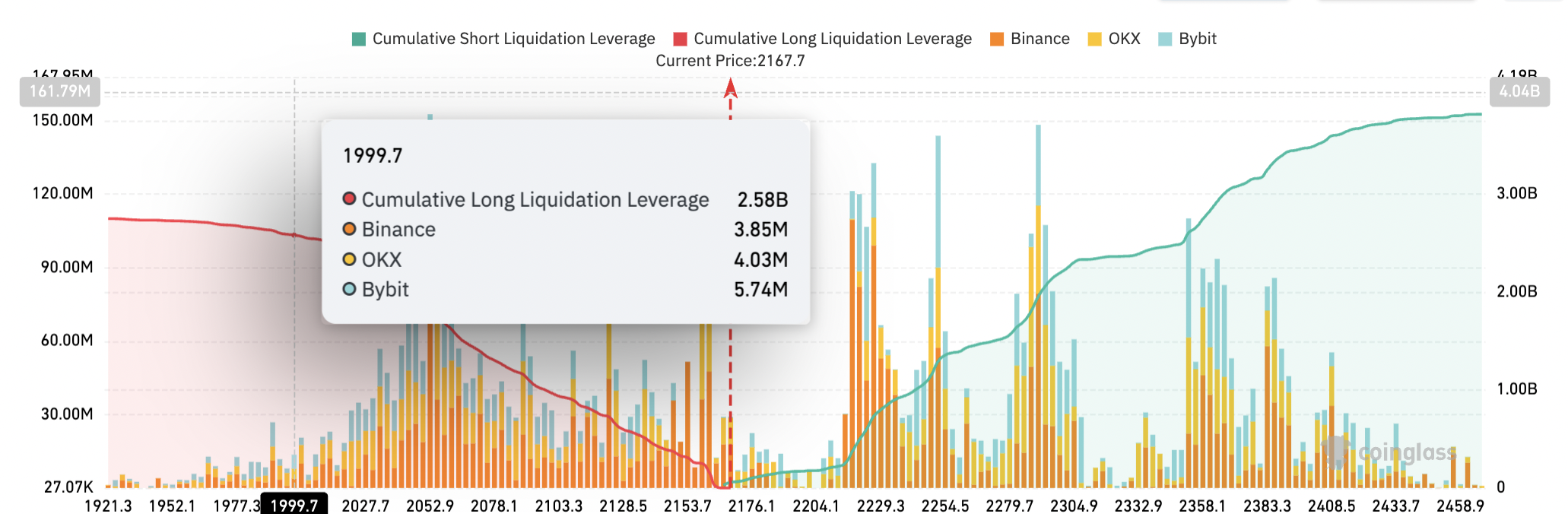 数据显示,以太坊下行风险可能取决于2000美元关键支撑位——一旦跌破该位置,所有交易所的杠杆多头强平总额将超过25亿美元。