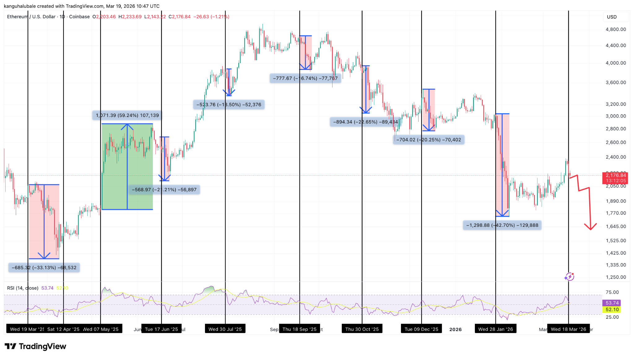 历史图表显示,在过往八次FOMC会议中,有七次会议后ETH/USD均出现下跌,这构成其历史上最清晰的宏观驱动分形模式之一。以太坊已形成固定模式:会议前趋稳或上涨,待决议及相关评论公布后旋即大幅回调。