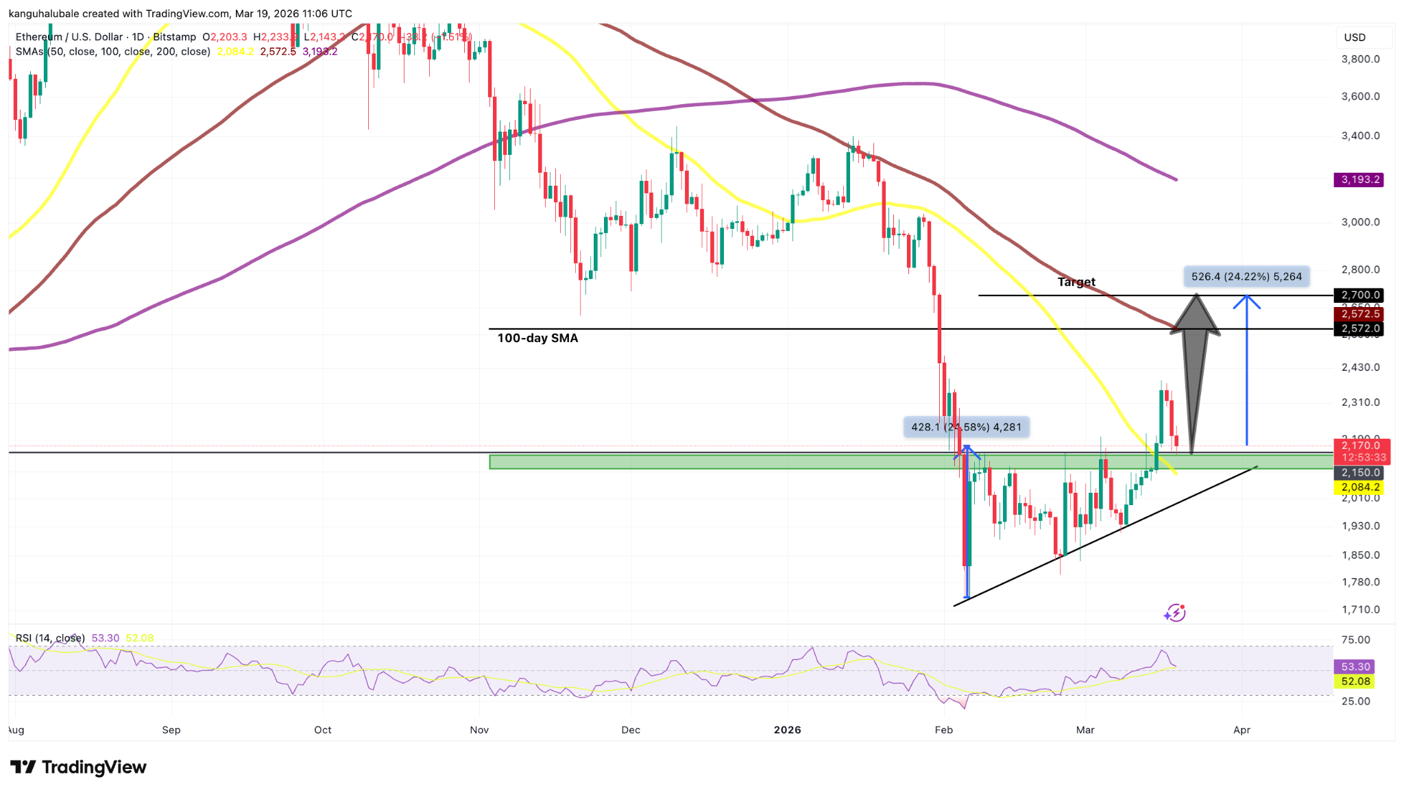 从技术面看,尽管存在宏观风险,以太坊仍保持谨慎看涨态势。价格正重新测试2100美元附近的关键支撑区域,该位置与上升三角形上沿趋势线及50日简单移动平均线重合。