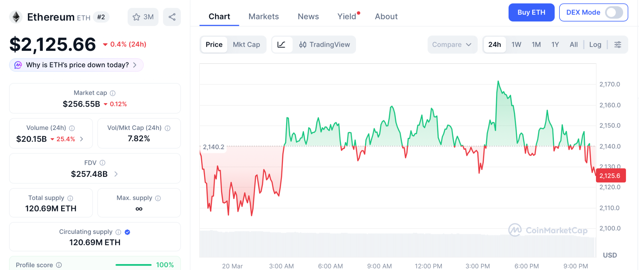 根据CoinMarketCap数据,ETH交易价格为$2,125,较近期高点$2,350有所下跌。尽管有所下跌,以太坊预测仍保持看涨,分析师目标看向2026年至2030年间达到$10,000。从$2,126到$10,000大约是4.7倍,这是一个强劲的长期持有机会。