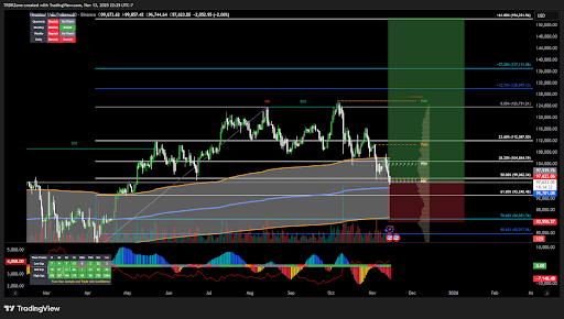 另一份图表详细展示了比特币在50%回撤位97,000美元附近的处境,该位置略高于61.8%回撤位93,000美元。包括EMA带状线、控制点和价值区域低点在内的多重技术工具在此形成密集支撑集群。