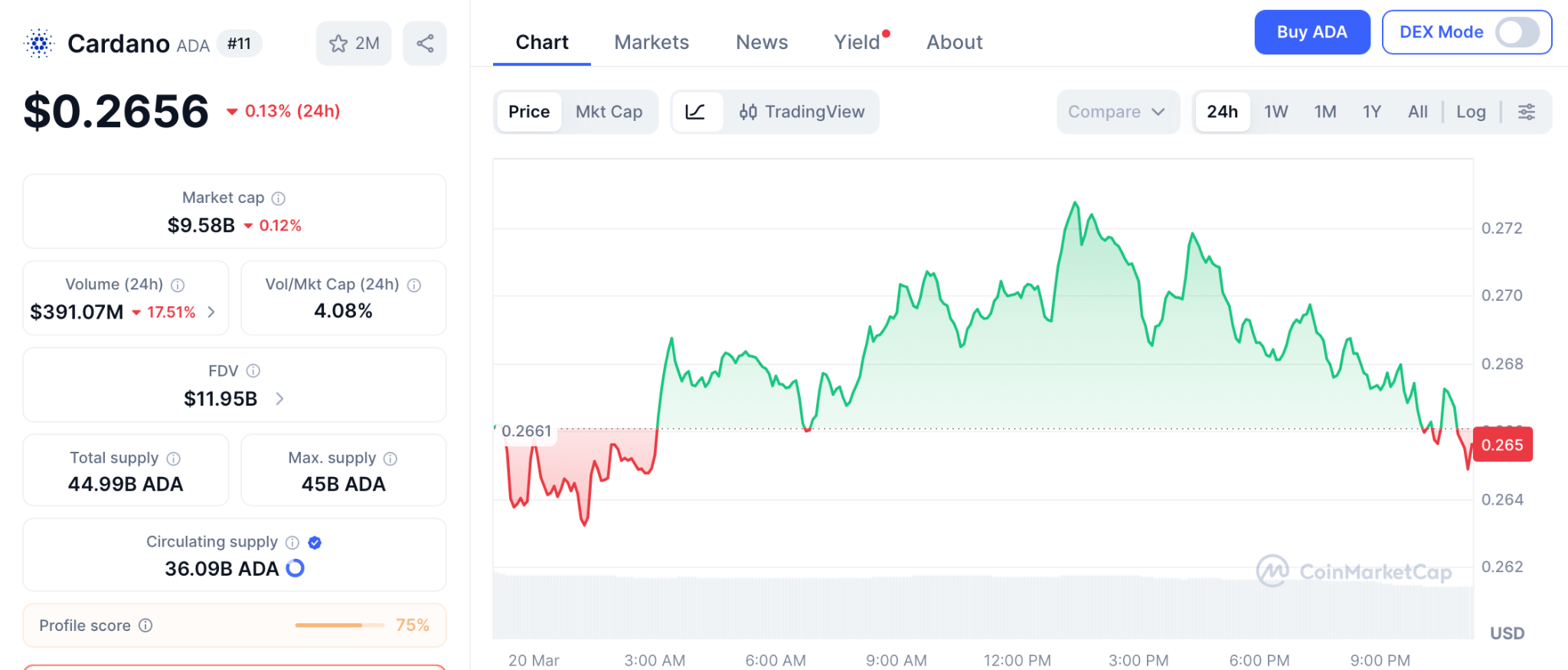 根据CoinMarketCap数据,随着大盘调整,ADA在3月20日报0.265美元。尽管短期下跌,许多交易者认为若ADA突破下降趋势线,卡尔达诺价格预测仍保持稳健。突破后首要目标为0.37美元,其次是0.44美元。