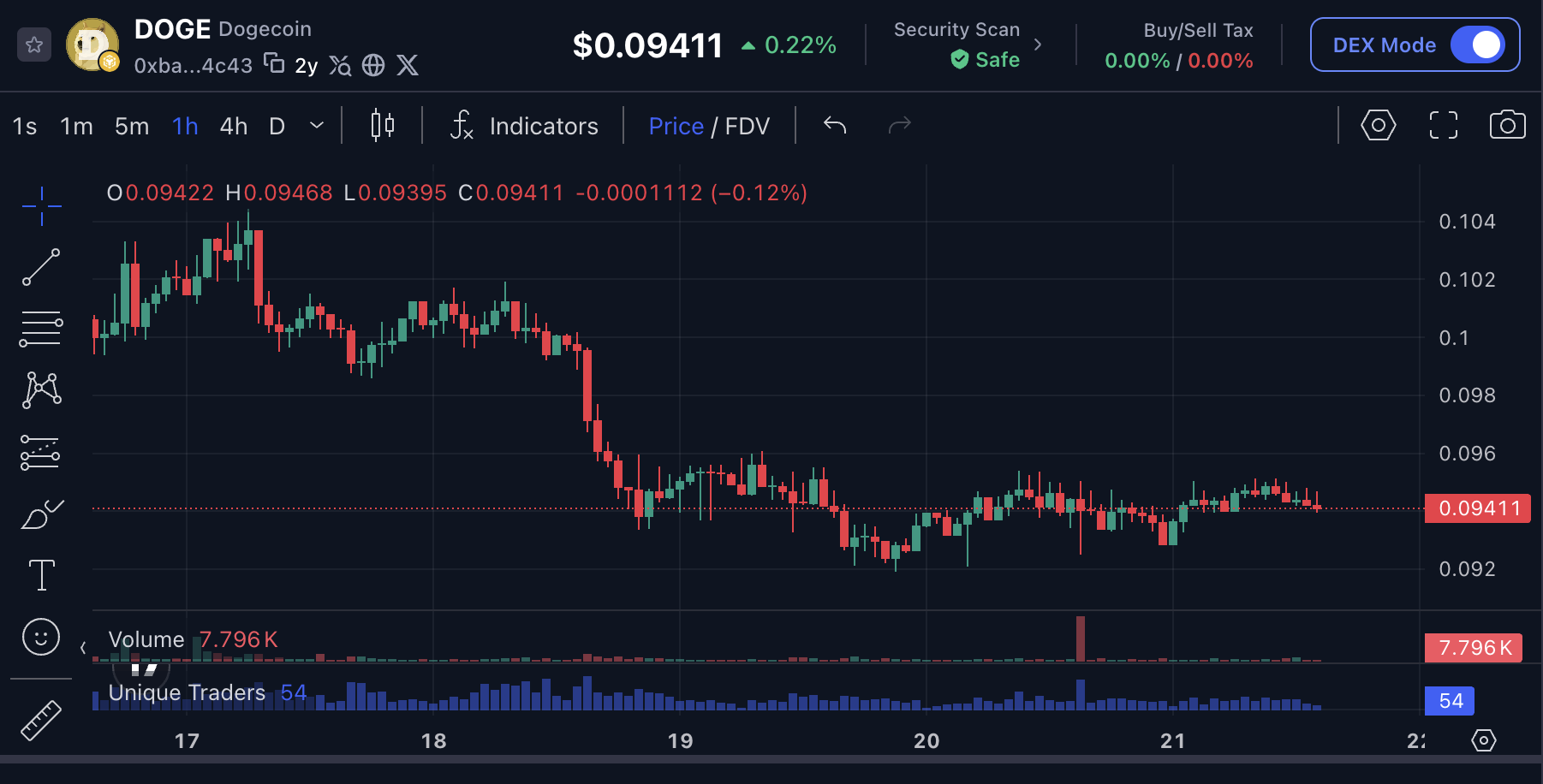DOGE停留在0.10美元,受制于下降的200日移动平均线和0.094美元的薄弱支撑之间。近期活跃地址
