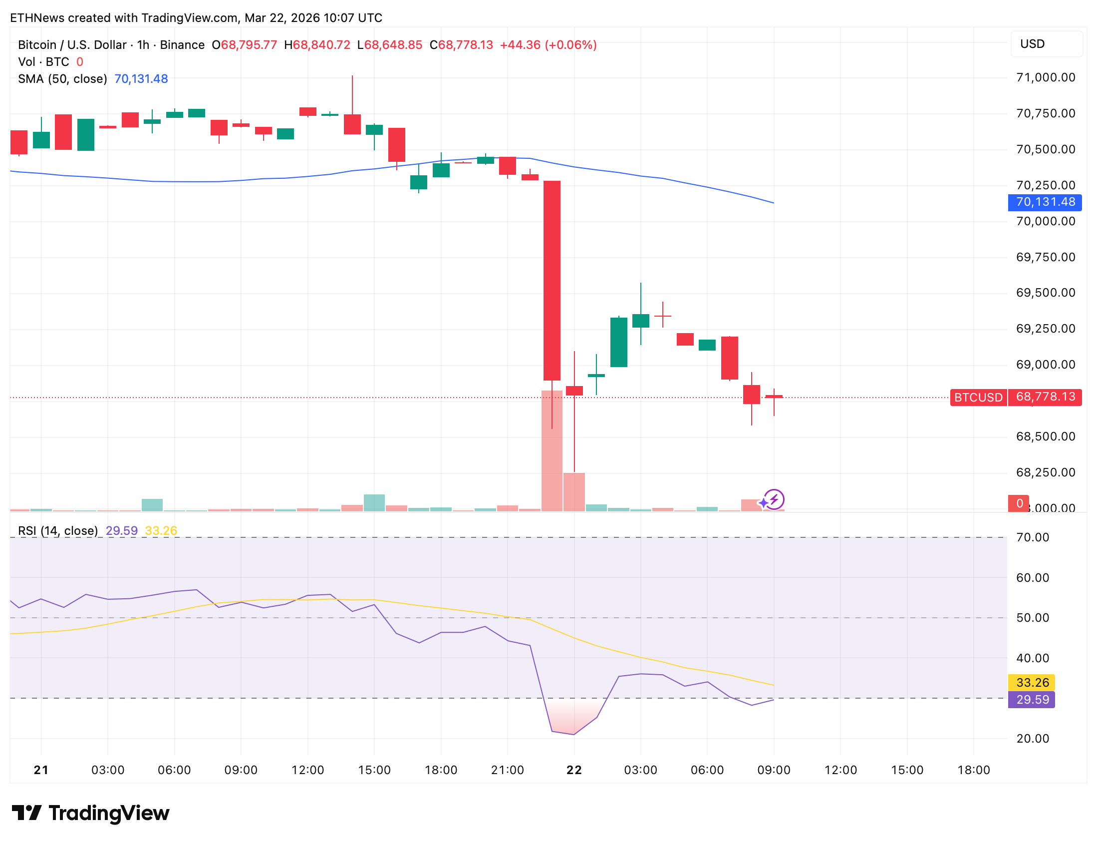 截至撰稿时,比特币在币安一小时图表上交易价格为68,778美元,经历隔夜动荡后小幅上涨0.06%。3月21日至22日凌晨的图表显示,周六价格多数时间在70,500至70,750美元的受控区间内波动,始终承压于50周期简单移动平均线(70,131美元)下方。该均线已呈下降趋势,日内持续压制反弹尝试。