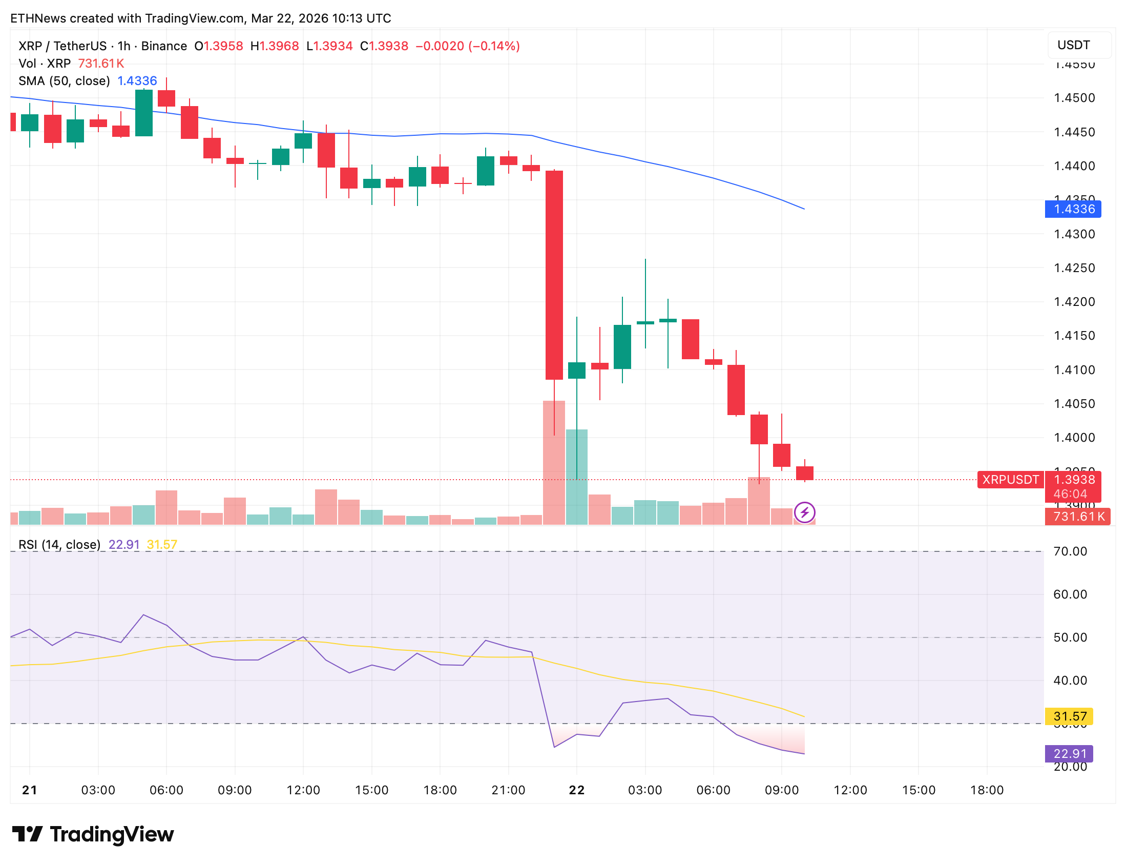 根据行情图表显示,截至撰稿时XRP在币安一小时图表中交易价格为1.3938美元,继两日窗口内出现最剧烈的单K线波动后,小时跌幅达0.14%。3月21日多数时间价格在1.40至1.45美元区间震荡,始终处于1.4336美元的50周期简单移动平均线下方,该均线全日维持下行斜率并持续压制反弹尝试。
