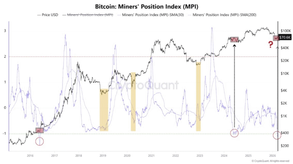比特币正面临新的抛压,在未能维持近期涨势后,已跌破7万美元关口。矿工持仓指数徘徊在-1.04的历史低位附近,表明矿工驱动的抛售活动已降至极低水平。分析师MorenoDV指出,当MPI从这种极端低点开始回升时,比特币的价格走势通常变得至关重要。