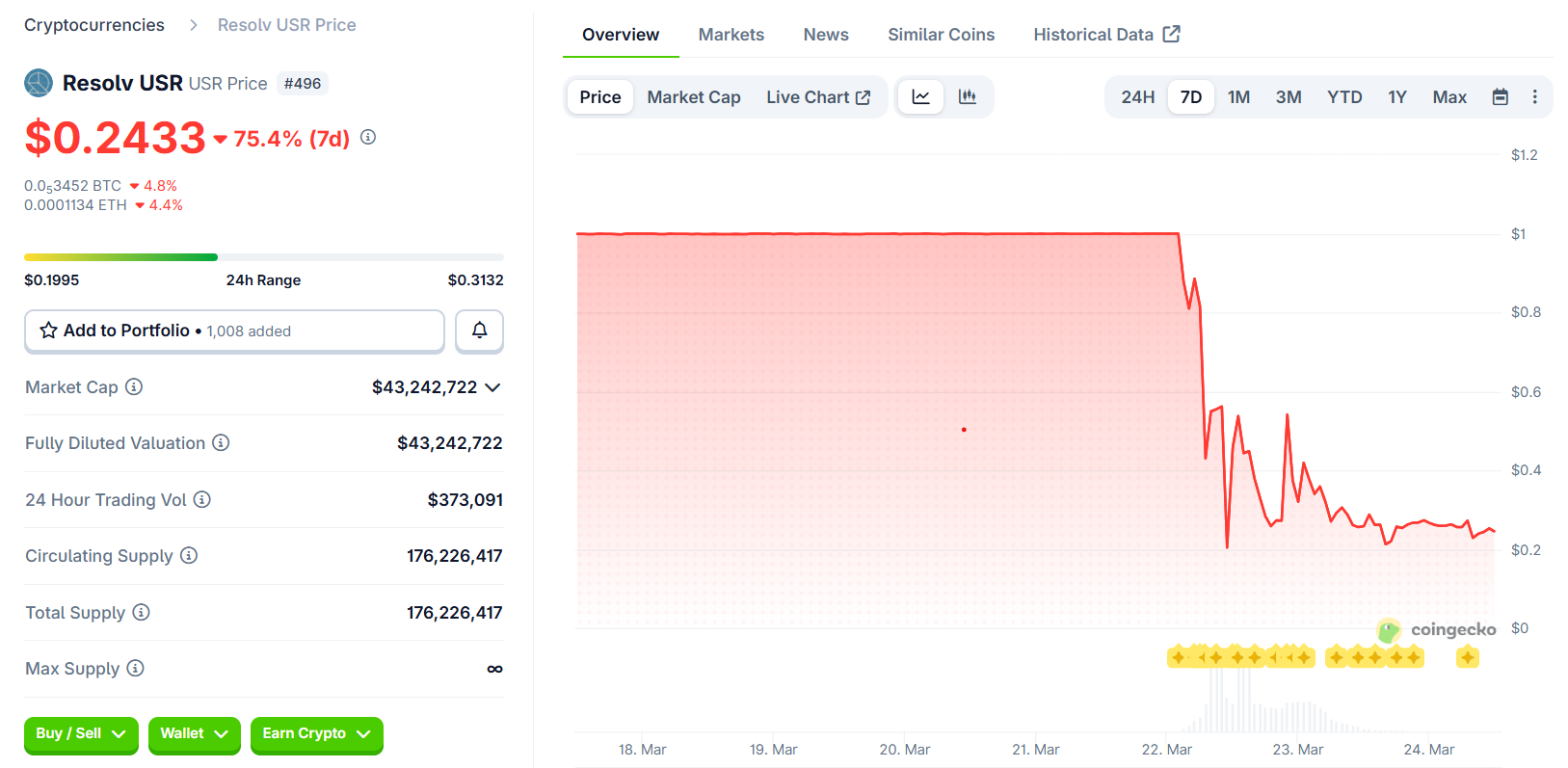 尽管链上分析显示攻击者已将大部分铸造的USR转换为以太坊(ETH)并抛售约2500万美元,Resolv此前声明抵押资金池仍保持完整,底层资产未受损失。目前USR交易价格约为0.24美元,远低于其1美元锚定目标。