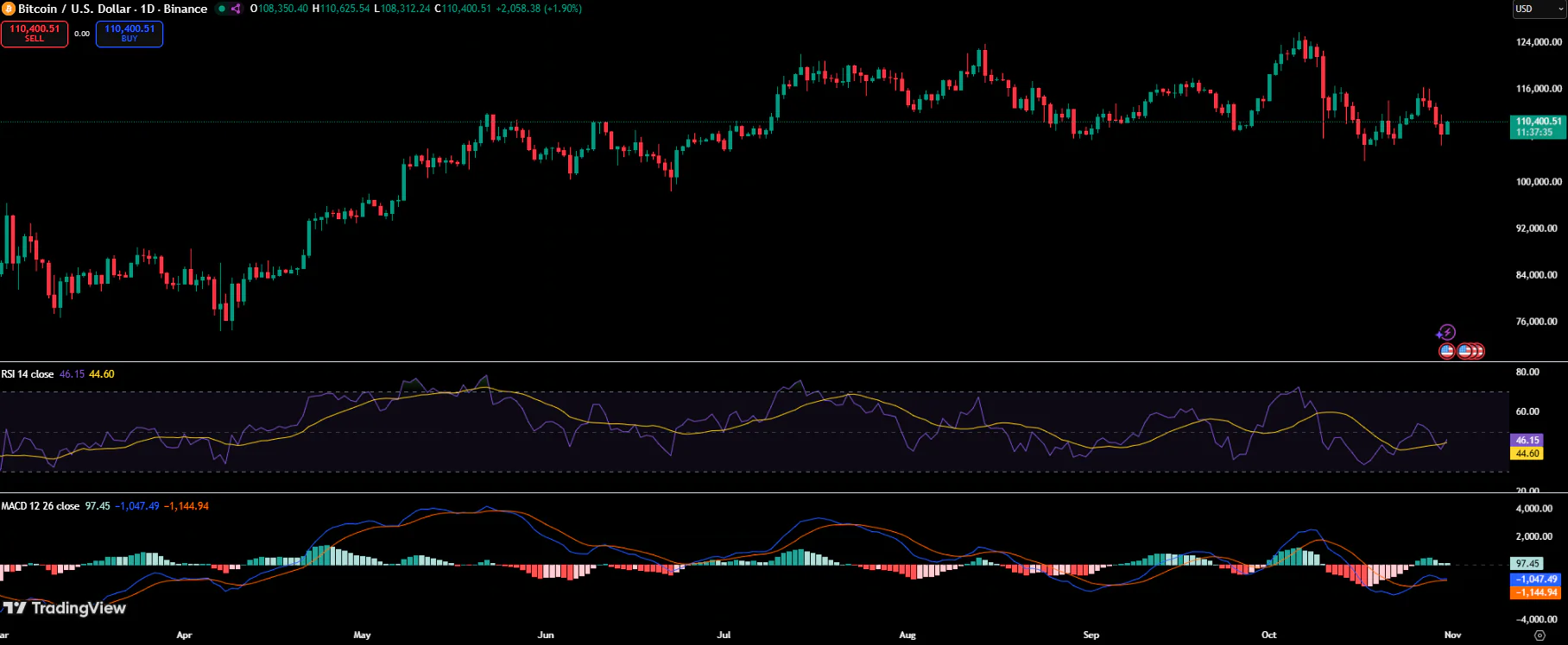 日线图显示比特币从局部低点反弹,正试图在11万美元上方建立稳固支撑。K线形态表明,在近期波动后出现渐进式复苏,买家在108,000美元附近进场护盘。TradingView数据显示,比特币日内收盘上涨近1.9%,报110,400.51美元。相对强弱指数(RSI)当前位于46,表明动能中性——既未超卖也未超买,该水平预示若买盘压力持续累积,后市仍有上行空间。