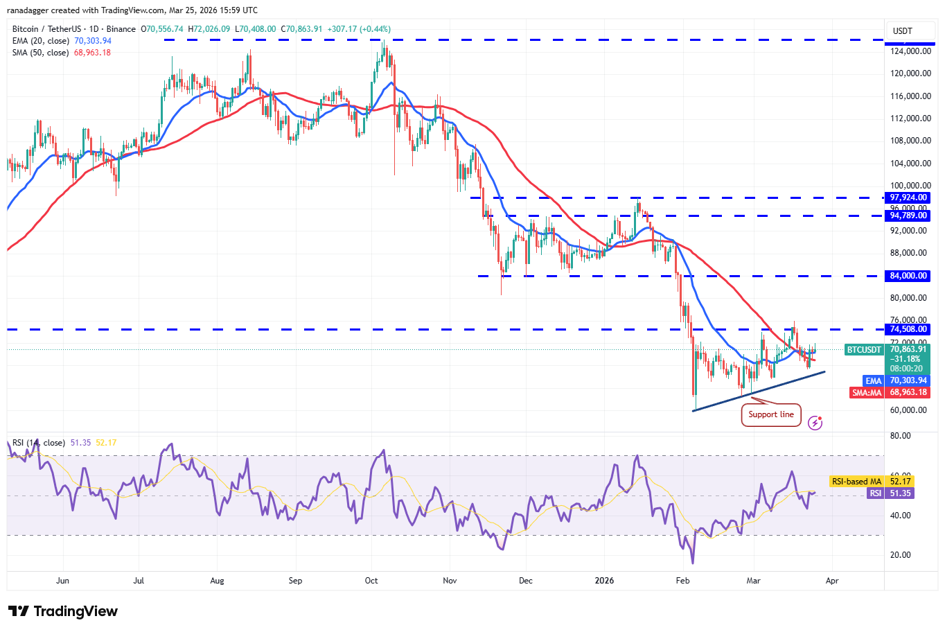 20日指数移动平均线呈现走平态势,相对强弱指数位于中点附近,多空双方均未取得明显优势。多头需将价格推高并维持在74,508美元阻力位上方以完成三角形突破。若能实现,BTC/USDT交易对可能攀升至84,000美元。反之若价格掉头跌破支撑线,则意味着多头放弃抵抗,该交易对可能下探62,500至60,000美元支撑区间。