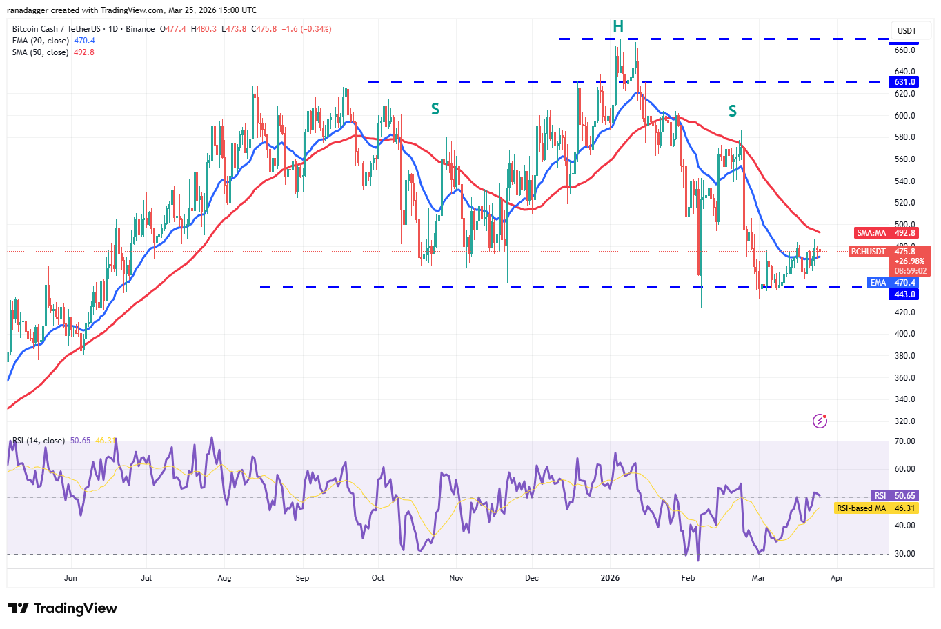 比特币现金周一收于20日EMA上方,但多头难以将价格推至50日SMA位置。