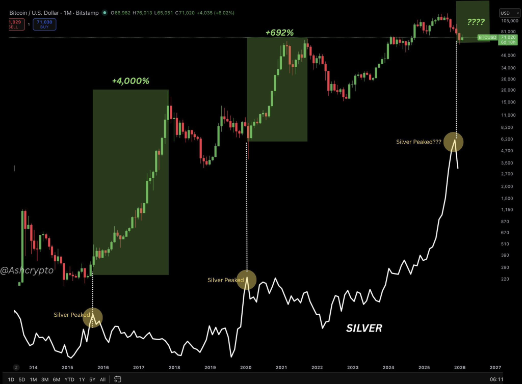 Altcoin Buzz近期分析指出,白银见顶与比特币上涨之间存在反复出现的关联模式。数据显示,2016年白银率先见顶后,比特币在次年攀升至19000美元;类似结构在2020年重现,白银触顶后比特币在下一周期阶段突破69000美元。