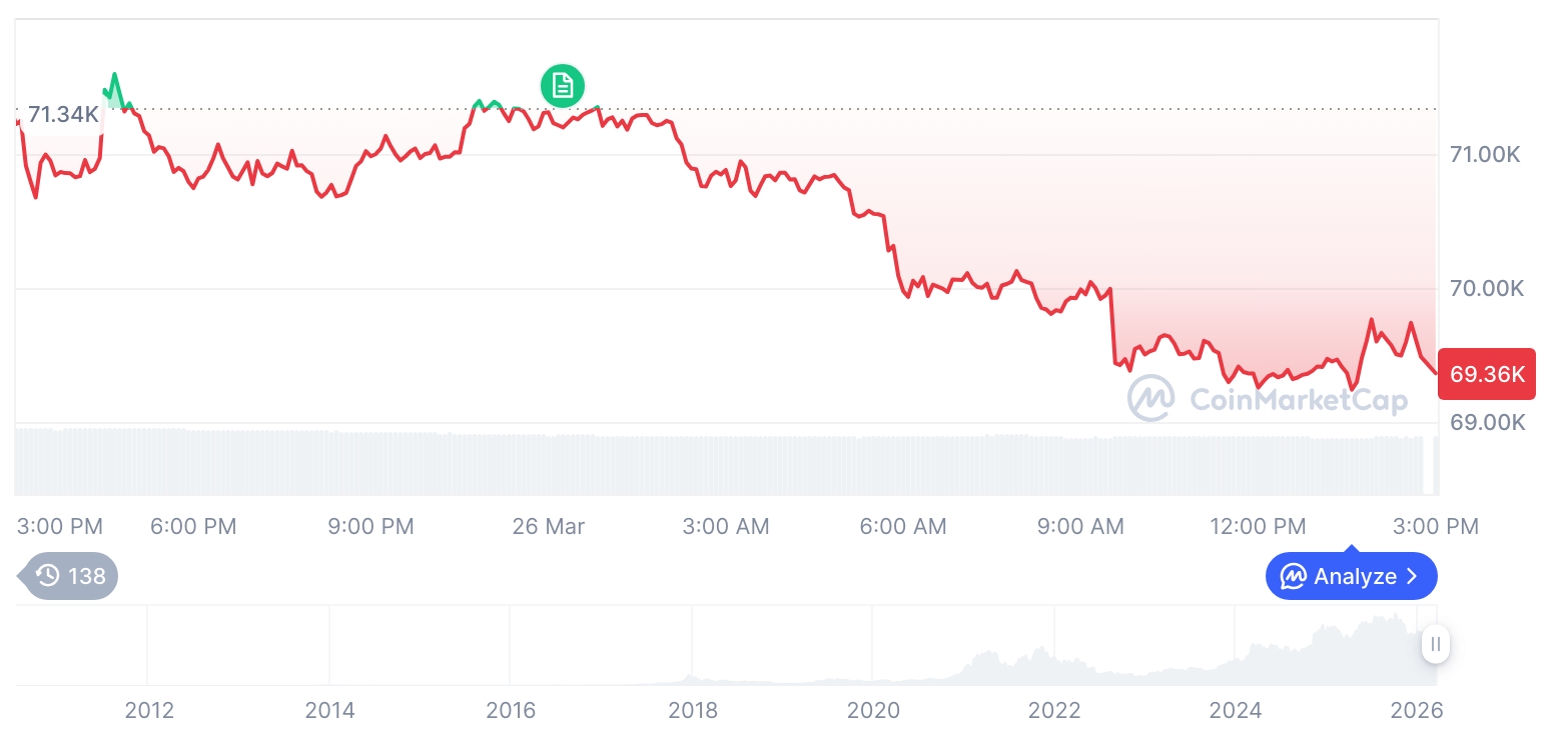 2026年3月26日:比特币本周跌破69,000美元。早期买家正在观望。3月23日,比特币跌至68,200美元。恐惧与贪婪指数达到27,这意味着目前大多数交易者感到恐惧。仅24小时内,超过4亿美元的加密货币押注就被清空。