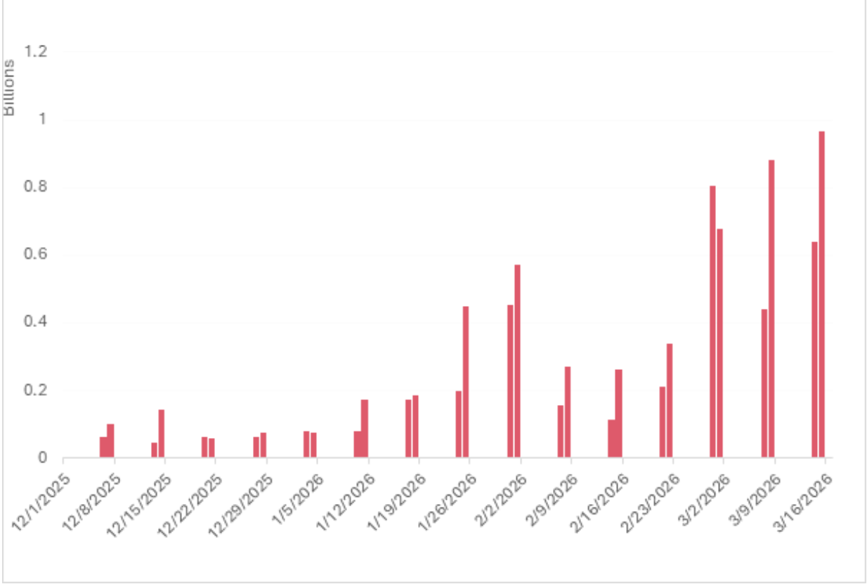 报告称,自2026年1月以来,HIP-3周末交易活动增长了约9倍,并补充道:“这很可能是因为在更广泛的山寨币市场持续表现不佳的背景下,加密原生交易者增持传统资产的趋势有所上升。”