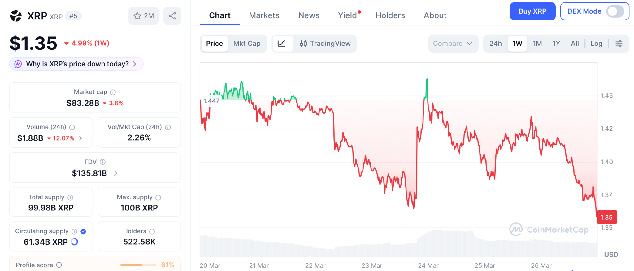 据CoinMarketCap数据,XRP交易价1.35美元,多空双方在均线密集区展开拉锯。