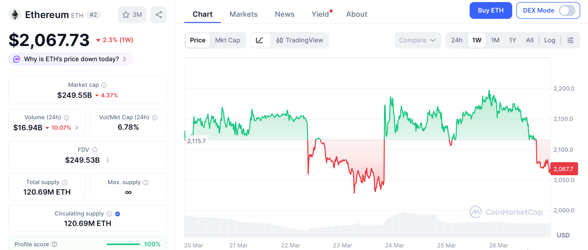 根据CoinMarketCap数据,ETH现报2,067美元,持有100至10万枚ETH的钱包正于2,050美元支撑区附近买入。