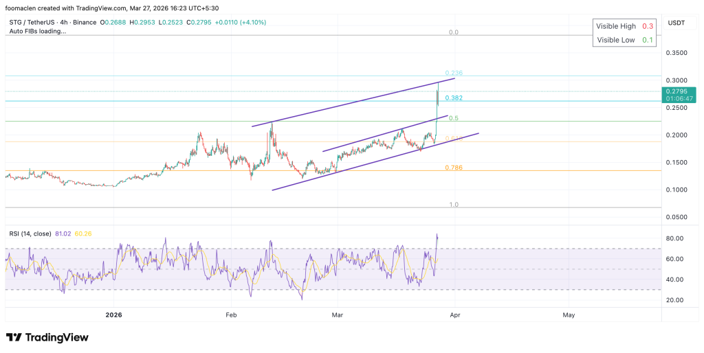 当前价格已突破所有斐波那契回撤位与指数移动平均线,相对强弱指数达80进入超买区间,但趋势尚未反转。结合社交媒体情绪与放量态势,STG可能在当前区间震荡整理后构筑更高高点。若走势延续,0.3美元将成为重要心理阻力位。
