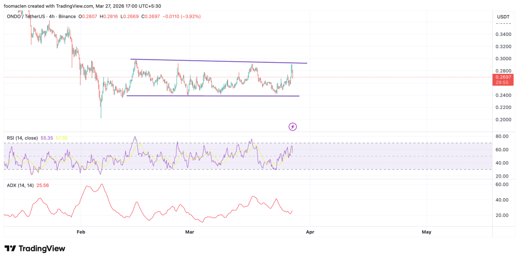 ONDO/USDT四小时图显示价格运行于微幅下倾通道,0.29美元构成强劲阻力区域。