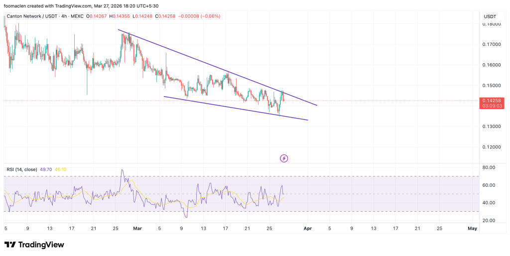 CC/USDT图表显示价格在下降三角通道内运行,0.1415美元形成强支撑,0.1483美元则为关键阻力。相对强弱指数处于50中性区域,动量指标呈中性。需关注价格能否确认突破0.1483美元以确立趋势。