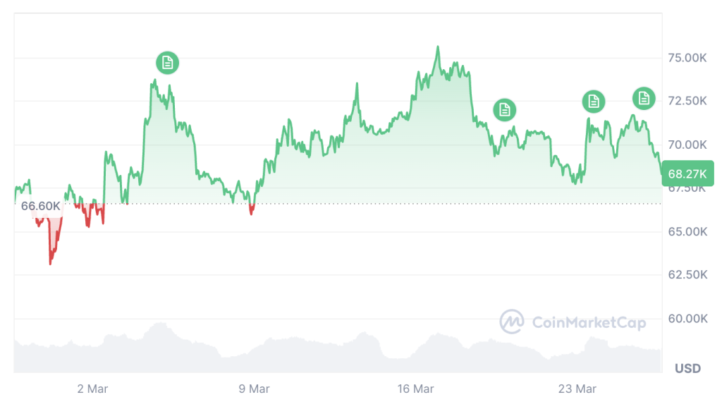 根据CoinMarketCap数据,比特币在撰写本文时交易价格为68,895美元。过去30天内上涨了6.06%。