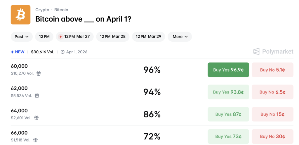 Polymarket的专家们认为,比特币在4月1日保持在66,000美元上方的可能性为72%。
