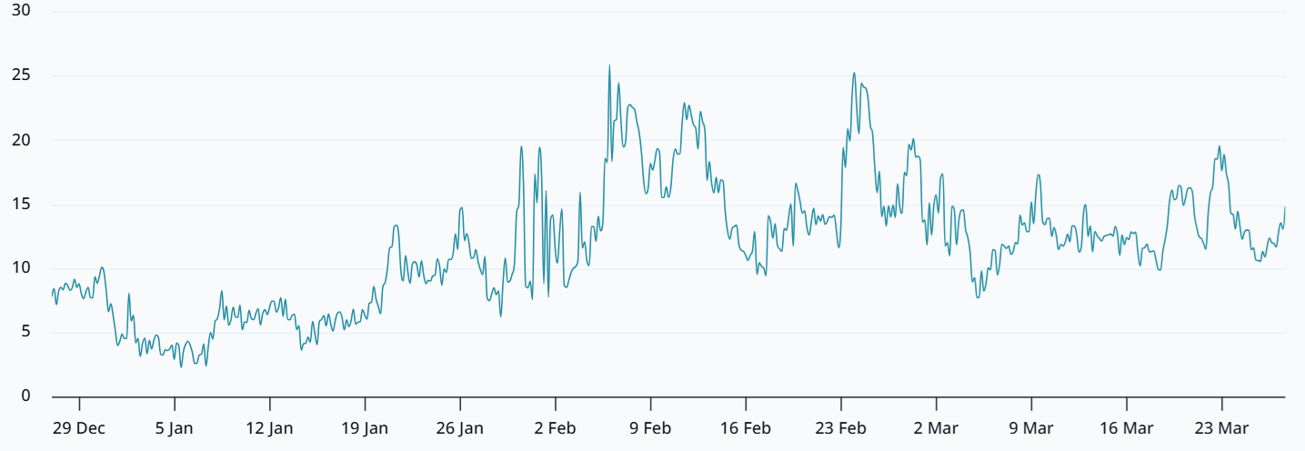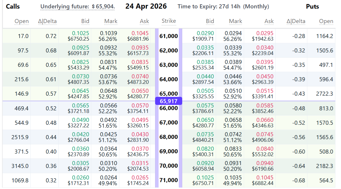 4月24日比特币66,000美元看跌(卖出)期权周五报价为0.0566 BTC(约合3,730美元)。隐含概率显示,截至4月底比特币交易价格低于66,000美元的可能性为53%。在美国与伊朗-以色列冲突不确定性加剧的背景下,市场情绪明确偏向看跌,推动交易员进入风险规避模式。