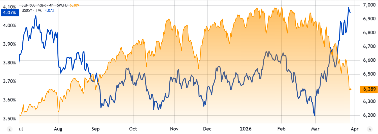 油价上涨以及可能增加的2000亿美元美国军费开支,促使投资者要求更高的国债收益率,导致标普500指数跌至2025年9月以来的最低水平。西德克萨斯中质原油(WTI)周五飙升至每桶100美元,5年期国债收益率从三周前的3.72%升至4.07%。