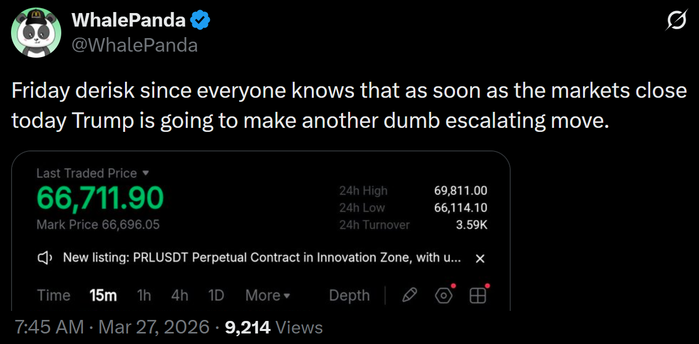 社交媒体用户WhalePanda指出,风险市场的暴跌预示特朗普可能在美国市场收盘后采取"另一个愚蠢的升级行动"。因此,若周一前未发生重大地缘政治事件,当前期权市场的恐惧情绪可能出现逆转。