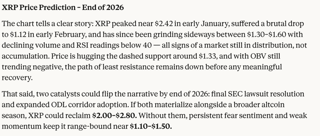 XRP在一月初触及2.42美元后急剧下挫,至二月已跌至1.12美元。此后价格持续在1.30至1.60美元间震荡徘徊。