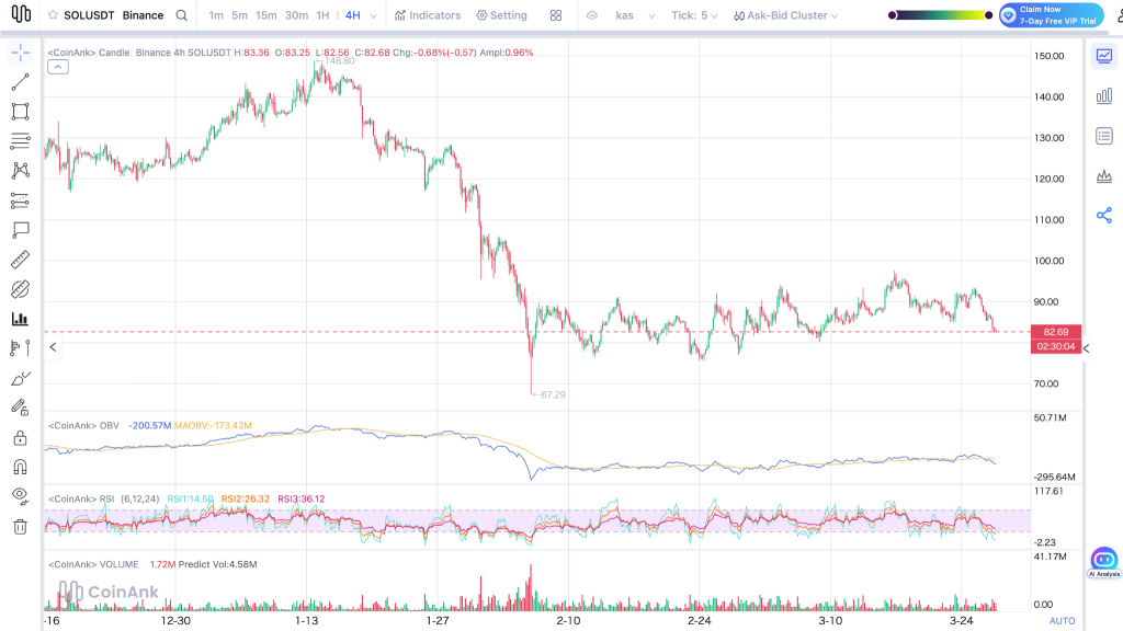 SOL价格现正位于82.69美元支撑位。若失守此位,或将重新测试67至75美元区间支撑;若能坚守,则延续震荡格局。