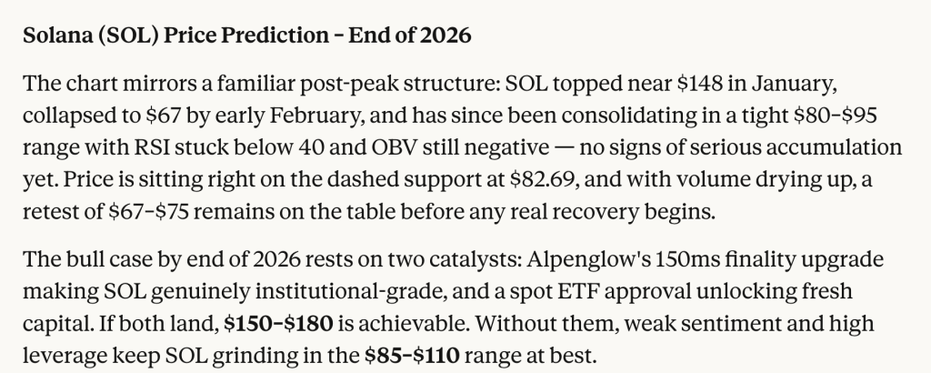2026年底前SOL的看涨预期主要取决于两大因素:核心是名为“Alpenglow”的共识升级,这将把最终确认时间缩短至150毫秒——相较于当前约12秒的水平是质的飞跃,此类性能突破可能真正引起机构投资者的重视。