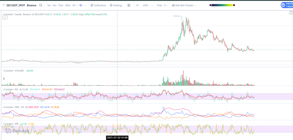 观察ZEC的日线图,其价格为38.92美元,涨幅为5.39%,振幅为6.53%。这与之前提到的226美元价位相去甚远,但图表显示Zcash价格交易在低得多的水平,这符合其波动性特点,并需要考虑当前的市场数据。