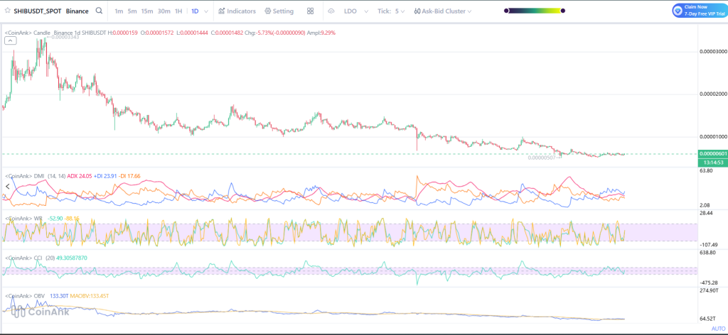 我们查看了SHIB的日线图,其价格为0.00001482美元,下跌了5.73%,振幅为9.29%。这进一步证明了由于Shibarium基础设施升级带来的市场波动性。