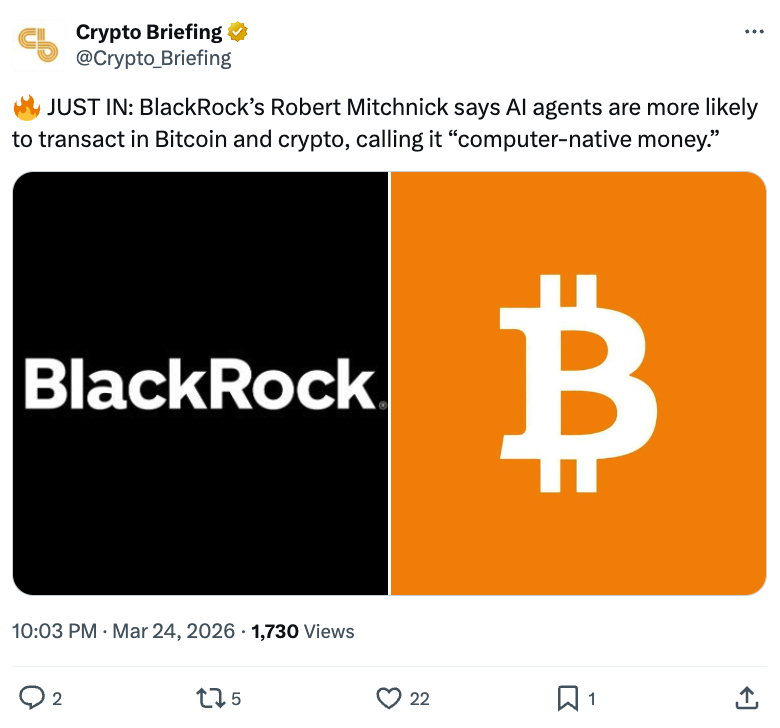 贝莱德数字资产主管Robbie Mitchnick将比特币和以太坊定位为AI“计算机原生智能”的基础设施。他将加密货币描述为“计算机原生的货币”,是自主AI代理的理想选择。