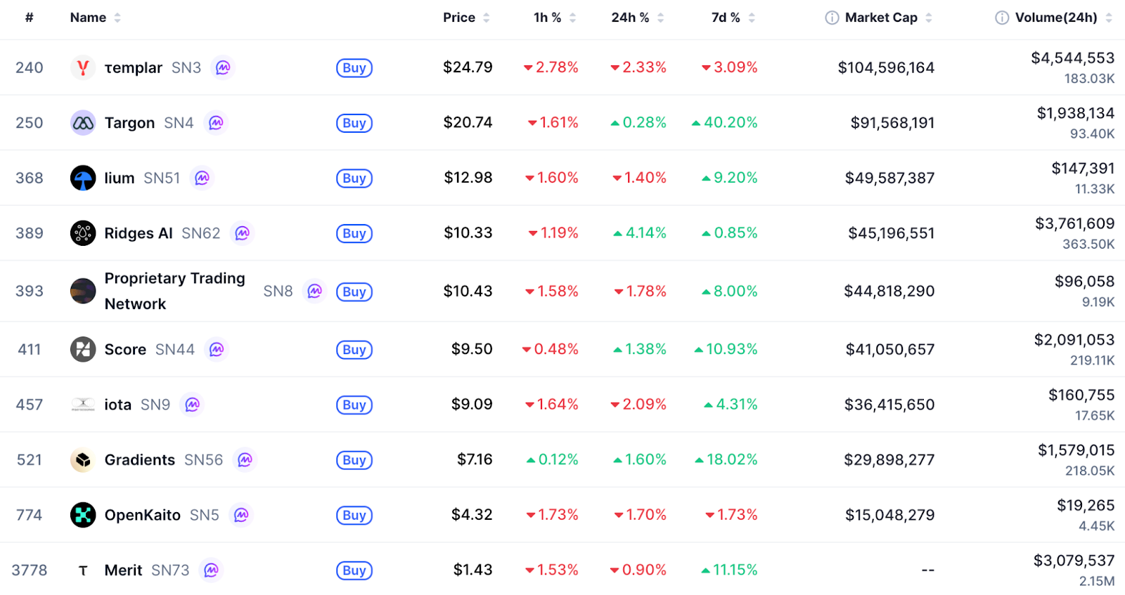 Bittensor的子网也呈现出近乎全领域的改善,前十大子网中有八个周环比实现正增长。其中Targon (SN4)表现尤为突出,周环比涨幅达40.2%(下文将详述)。
