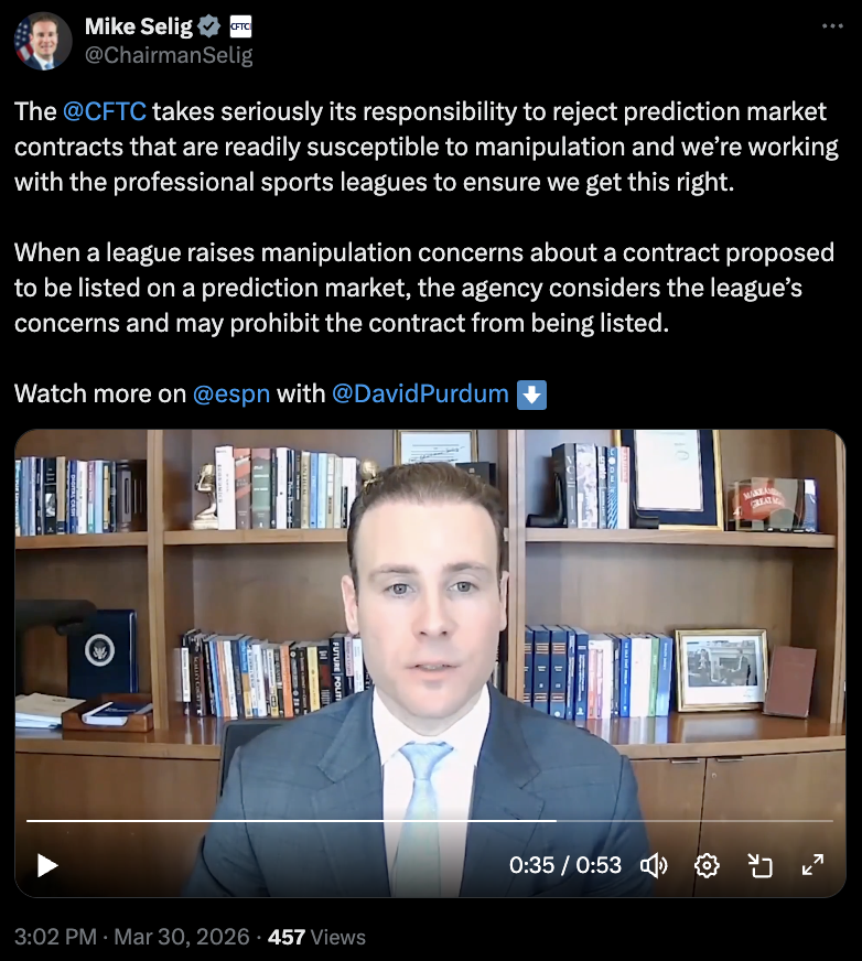 在塞利格的领导下,CFTC正朝着主张对预测市场拥有“专属管辖权”的方向推进,尽管美国多州博彩监管机构仍在持续对Kalshi和Polymarket等平台提起诉讼。本月初,美国职业棒球大联盟(MLB)应“诚信保护”要求,已与美国监管机构签署谅解备忘录。