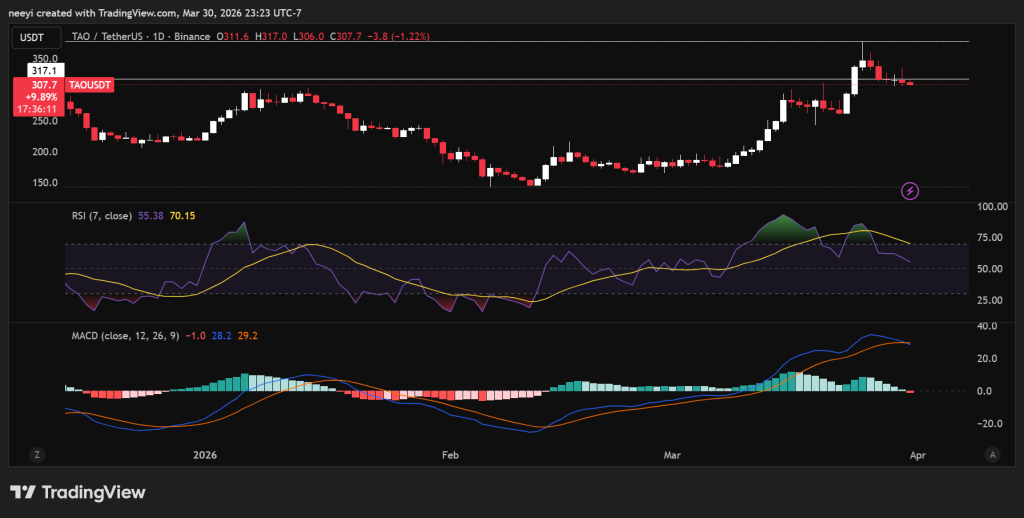尽管近期出现回调,Bittensor在更长时间框架上仍保持强劲结构。该资产曾从172美元附近急涨至375美元,当前价格约307美元仍处于该波动区间的上半部。斐波那契水平显示价格位于327至297美元的正常修正区域,且仍高于30日与200日移动平均线,确认长期趋势未改。