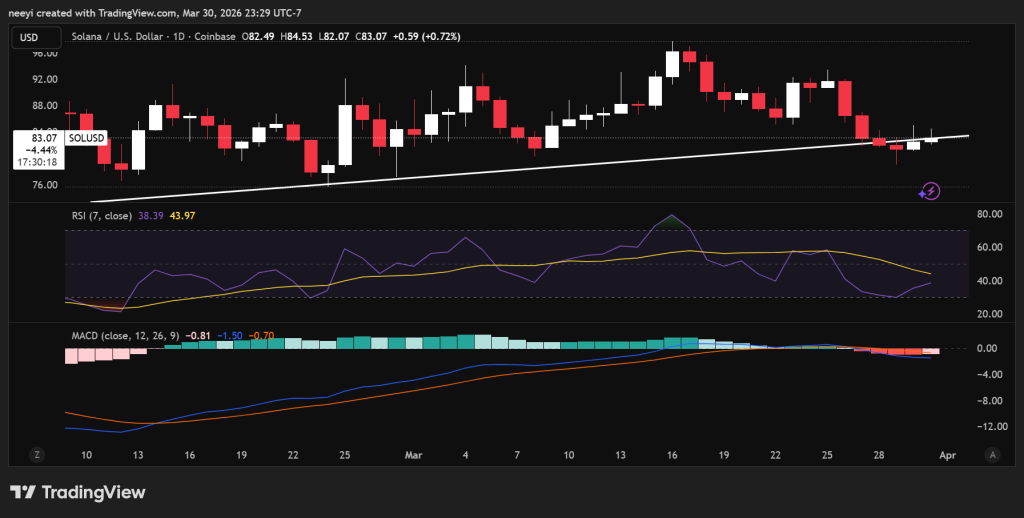动量指标持续疲软:RSI值徘徊在38附近,显示持续的卖压尚未达极端水平;MACD保持负值,确认下跌动能仍在延续。过去24小时价格几无变动,维持在83.5美元枢轴点附近,37.5亿美元的成交量意味着该位置的任何突破都可能快速演进。