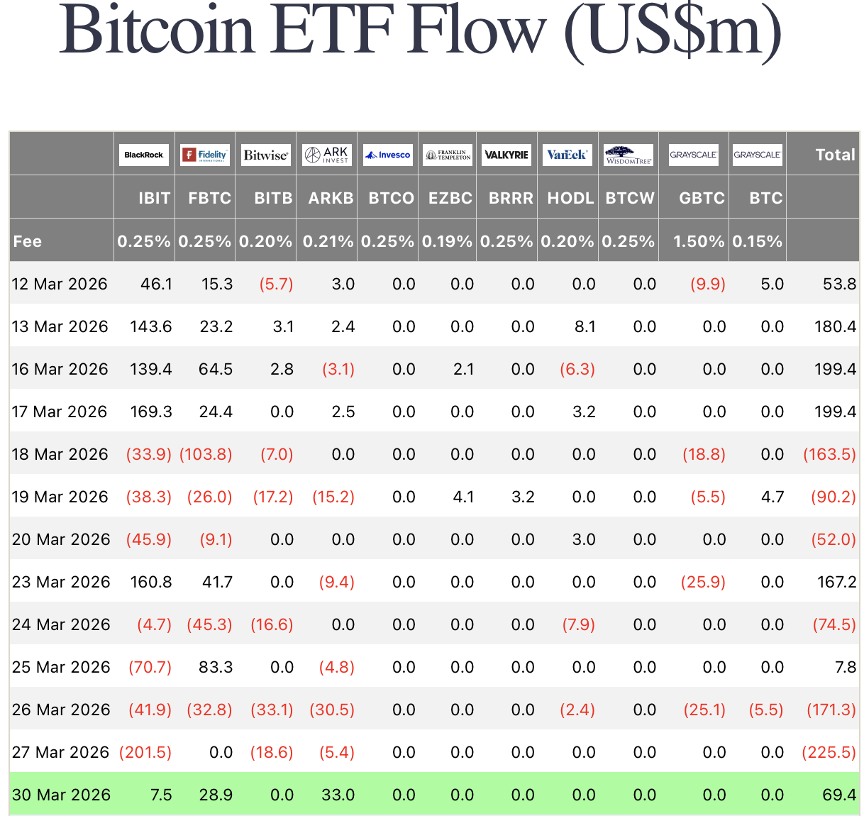 比特币和以太坊ETF周一的积极收盘并未抹去三月的艰难。本月两大资产类别均持续出现机构资金外流,仅有零星几个流入日带来喘息。结构性趋势——即大持有者利用三月中旬的反弹来减少风险敞口——在数据中清晰可见,并与收益率上升和地缘政治不确定性这一更广泛的宏观环境一致。