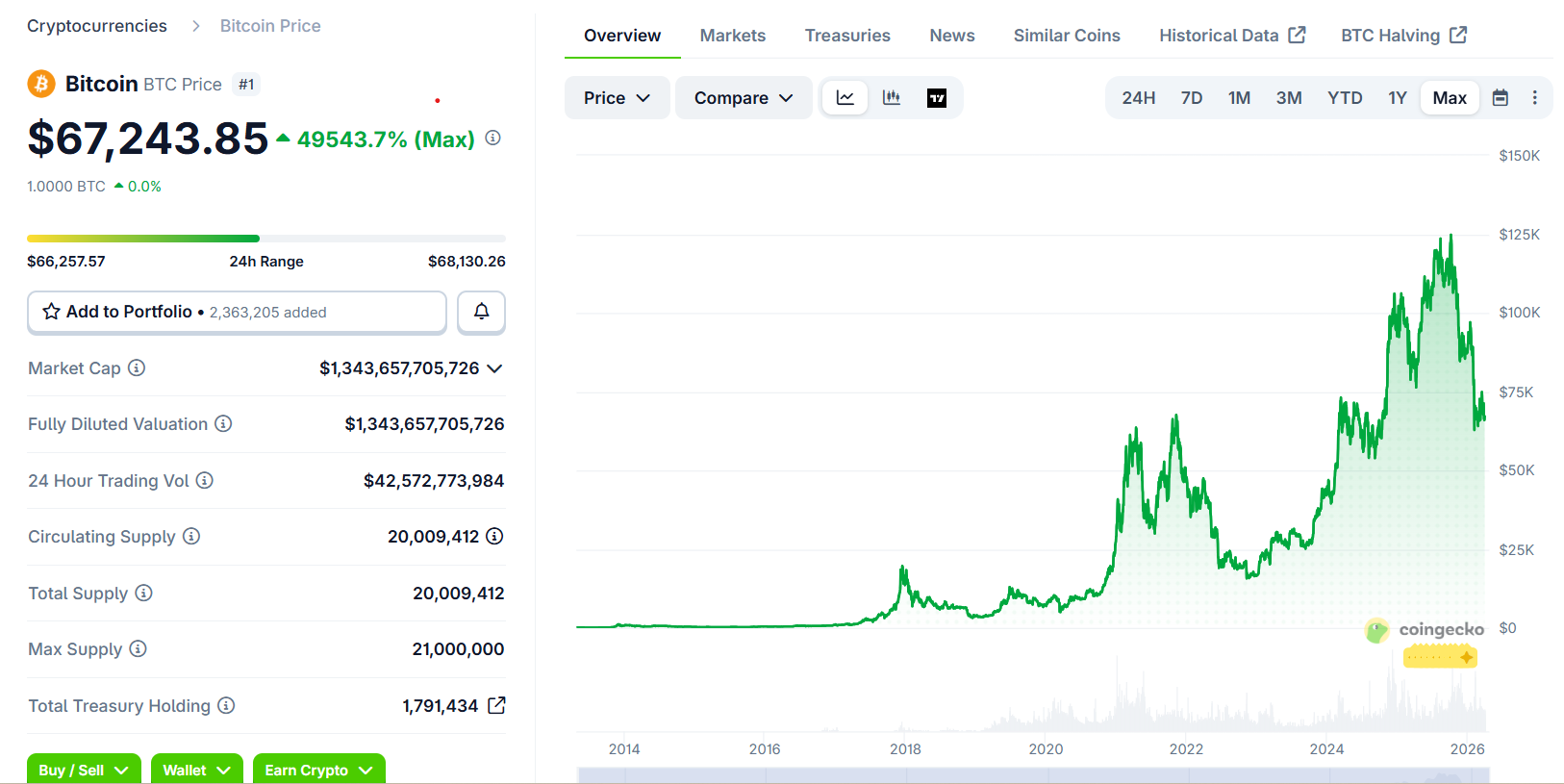 根据CoinGecko数据,比特币此后在2025年10月飙升至12.6万美元以上的峰值,撰写本文时交易价格约为6.7万美元。这使得最初的2900枚BTC在其峰值时价值3.65亿美元(价格上涨约46,500%),按当前水平计算约为1.94亿美元(上涨24,800%),尽管近期存在波动。