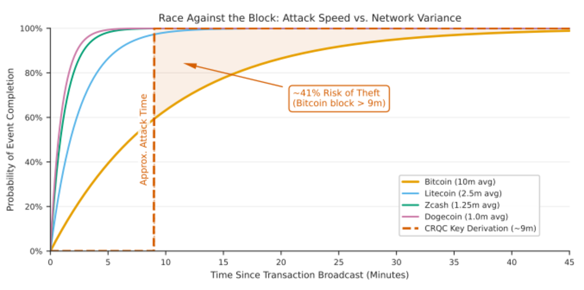 这个时间差至关重要。内存池攻击的原理如下:攻击者监视内存池中的交易,在交易确认前破解发送地址的私钥,然后广播一笔竞争交易以转移资金。凭借九分钟的破解时间,这个攻击窗口完全敞开。