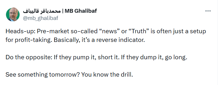 伊朗议会议长穆罕默德·巴吉尔·卡利巴夫在X平台上发布了一条盘前消息,称传统新闻是“反向指标”。他的帖子引发了网络舆论争议,并引发了对Polymarket战争押注和内幕交易的质疑。他写道:“如果他们拉高,就做空;如果他们砸盘,就做多。”这一建议与市场的实际波动高度吻合。科贝西通讯实时跟踪了这些变化,市场观察验证了卡利巴夫的账户,巴伦周刊则将周一的反弹描述为又一次受伊朗相关新闻影响的凌晨市场波动。